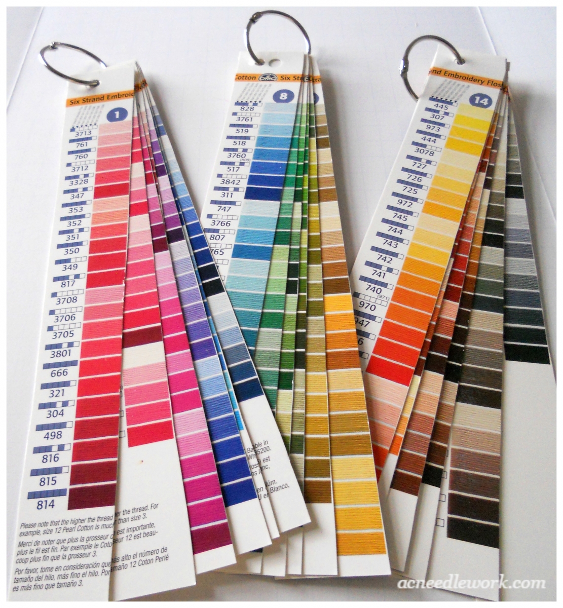 Make that DMC color chart you may have easier to use by cutting it up into strips. They end up looking like paint chip strips. Comparing shades of floss or just finding a floss number is quicker in this format. You can see the strips I made according to her instructions in this photo. Learn how to make them in Dana’s video on her Peacock and Fig blog.