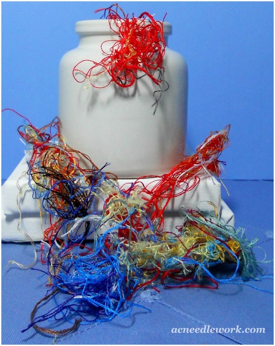 Does your stitching area look like this? Mine used to. Then I adopted a cat and a mess like this became a hazard for him. I needed something with a lid that I could put those little leftover threads in while I was actually stitching. My solution? Containers right from my kitchen. The one in the photo is a cute little crock that held some great French mustard my brother brought me from one of his trips to Paris.