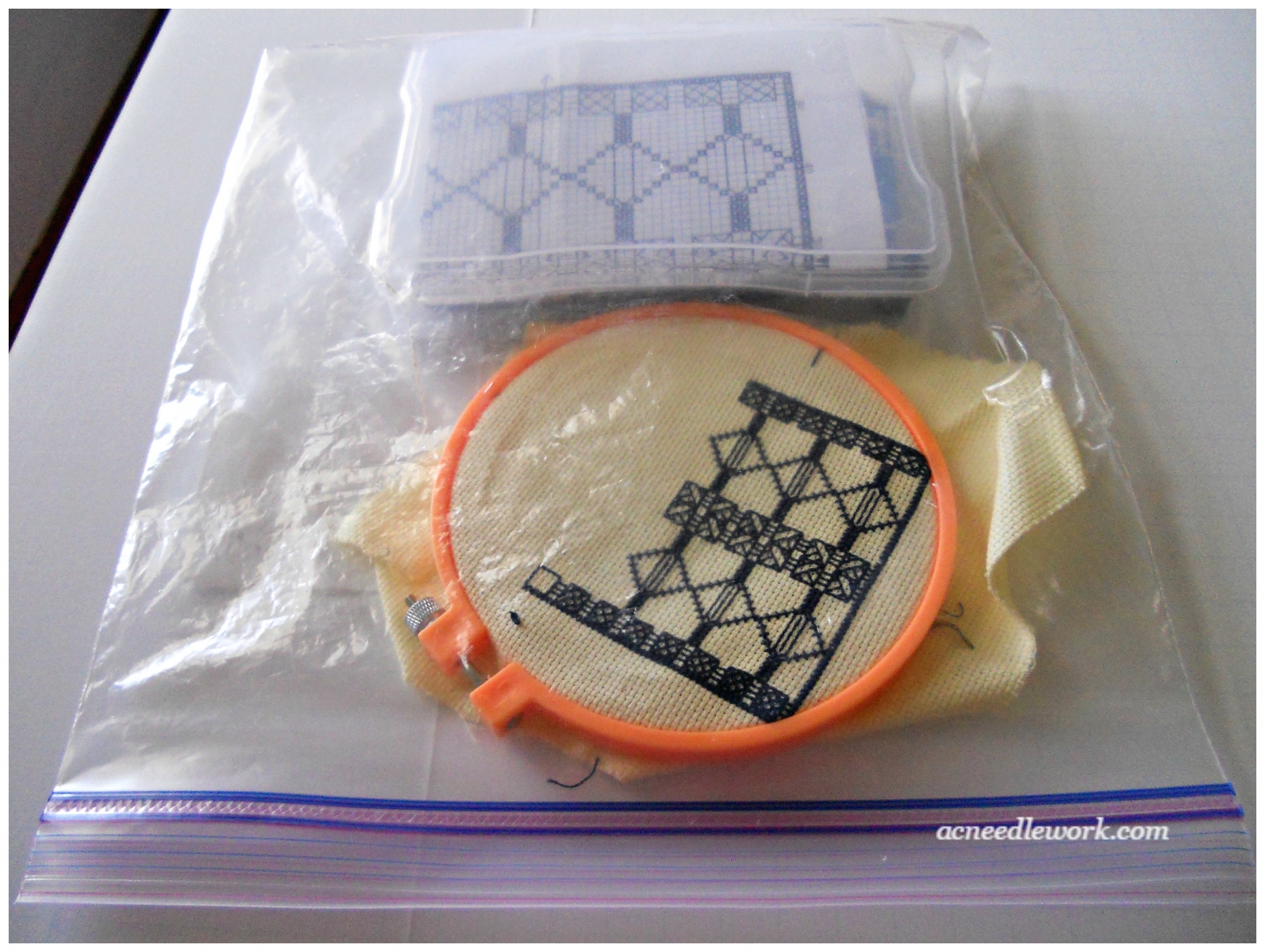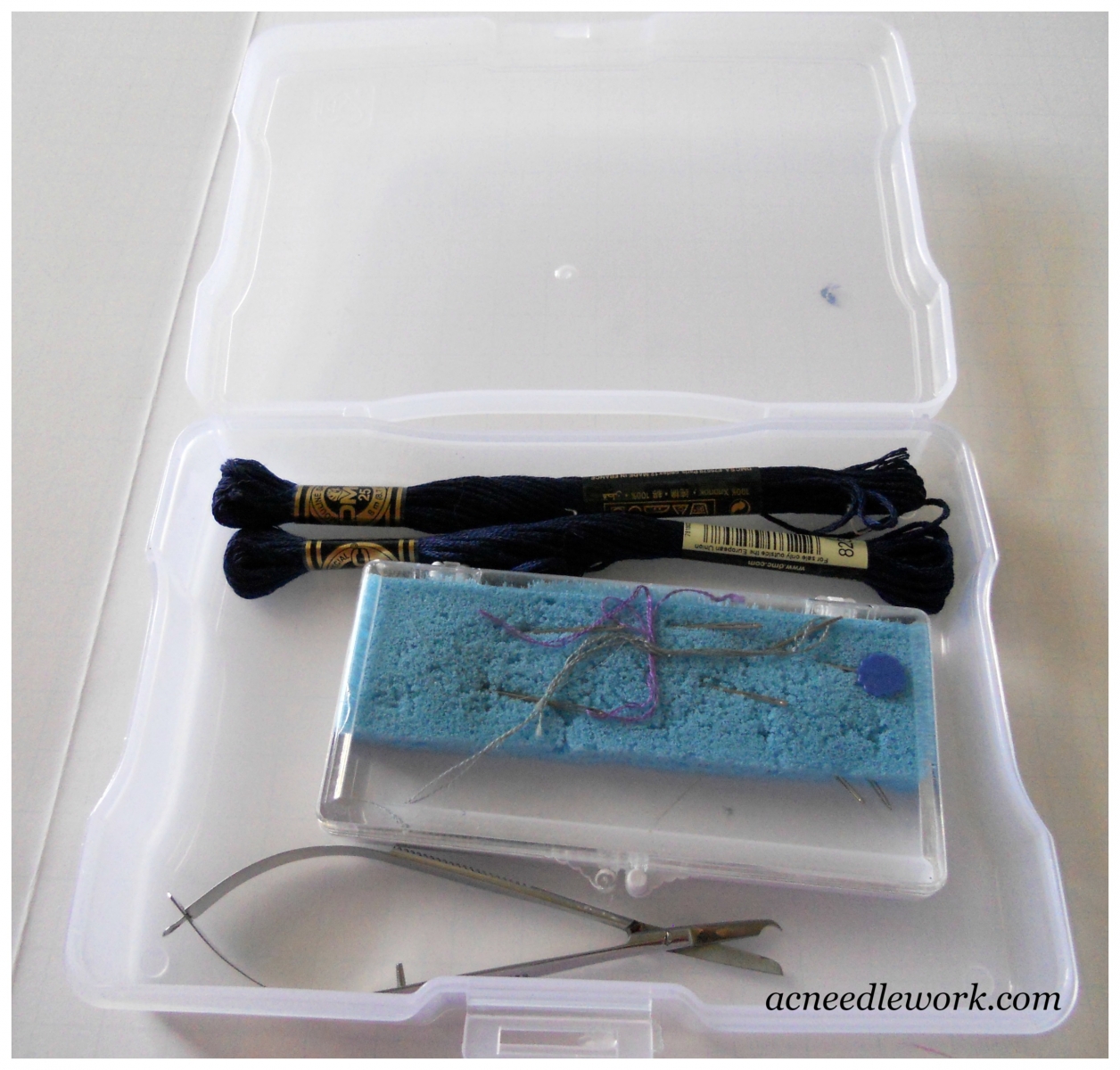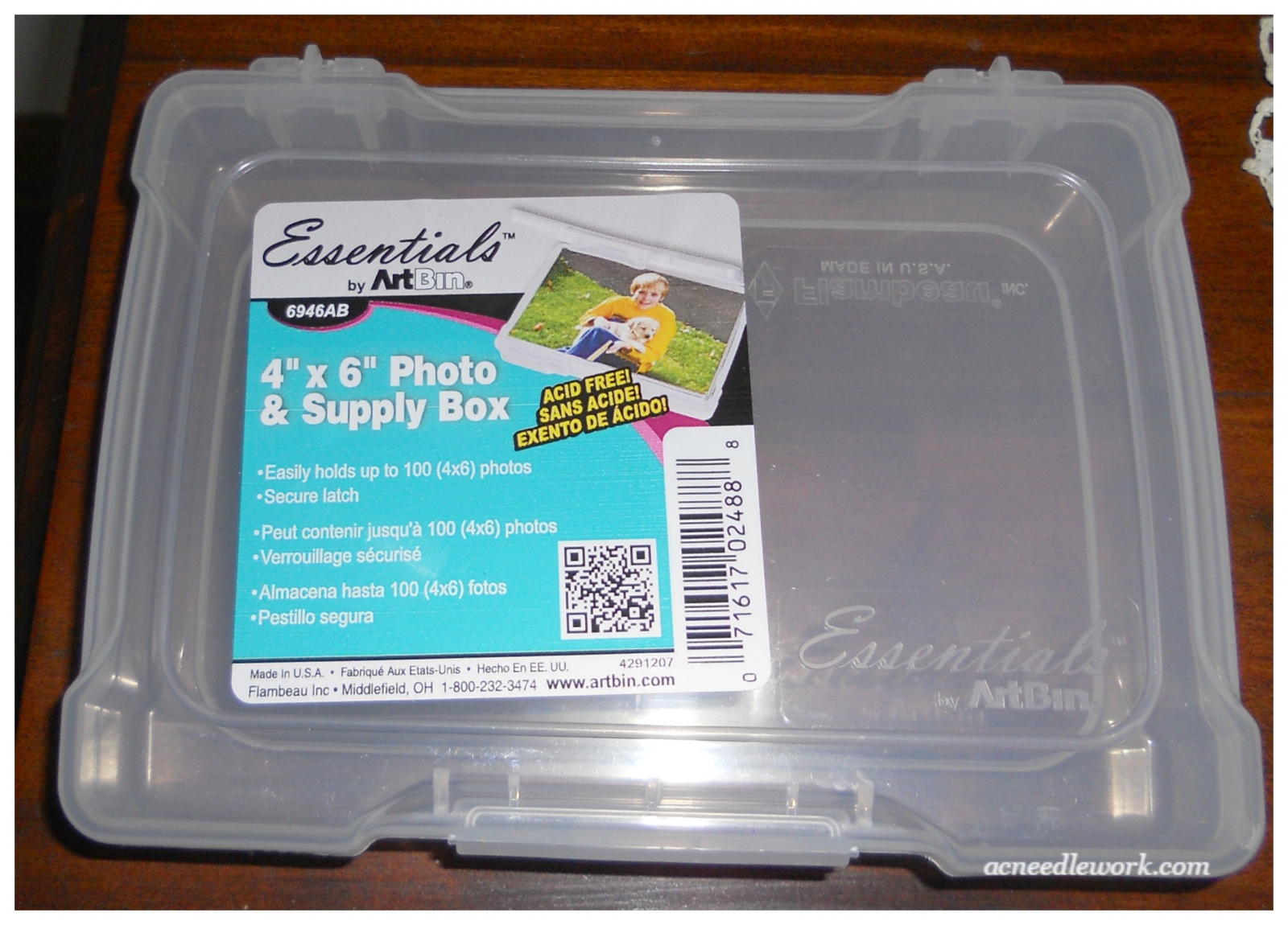 Lightweight and compact, your tools and supplies for a small stitching project fits in one perfectly. If your piece of stitching is small enough, it would fit in the box too. Since my project was too large for the box, I put it in a gallon zip lock bag, threw it in my purse and enjoyed passing the time away at my appointment. The photo boxes are available at most craft stores or on line. I found my first set at the Container Store years ago to organize my floss in. Those came in a large carrying case which makes storage great.