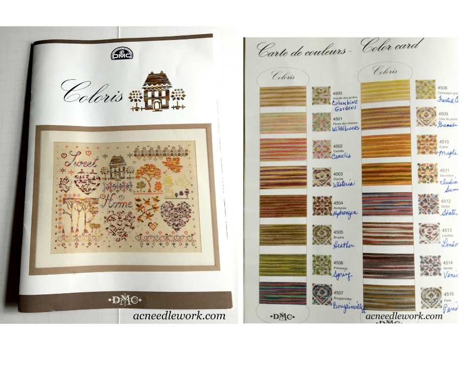 If you need some inspiration, DMC published a series of pattern booklets for the Coloris Floss. The booklet includes the pattern for the design you see on the front and a chart of the floss numbers and names along with stitched samples of the colors as seen in the photo above. (I wrote in the English translation for each color in mine).