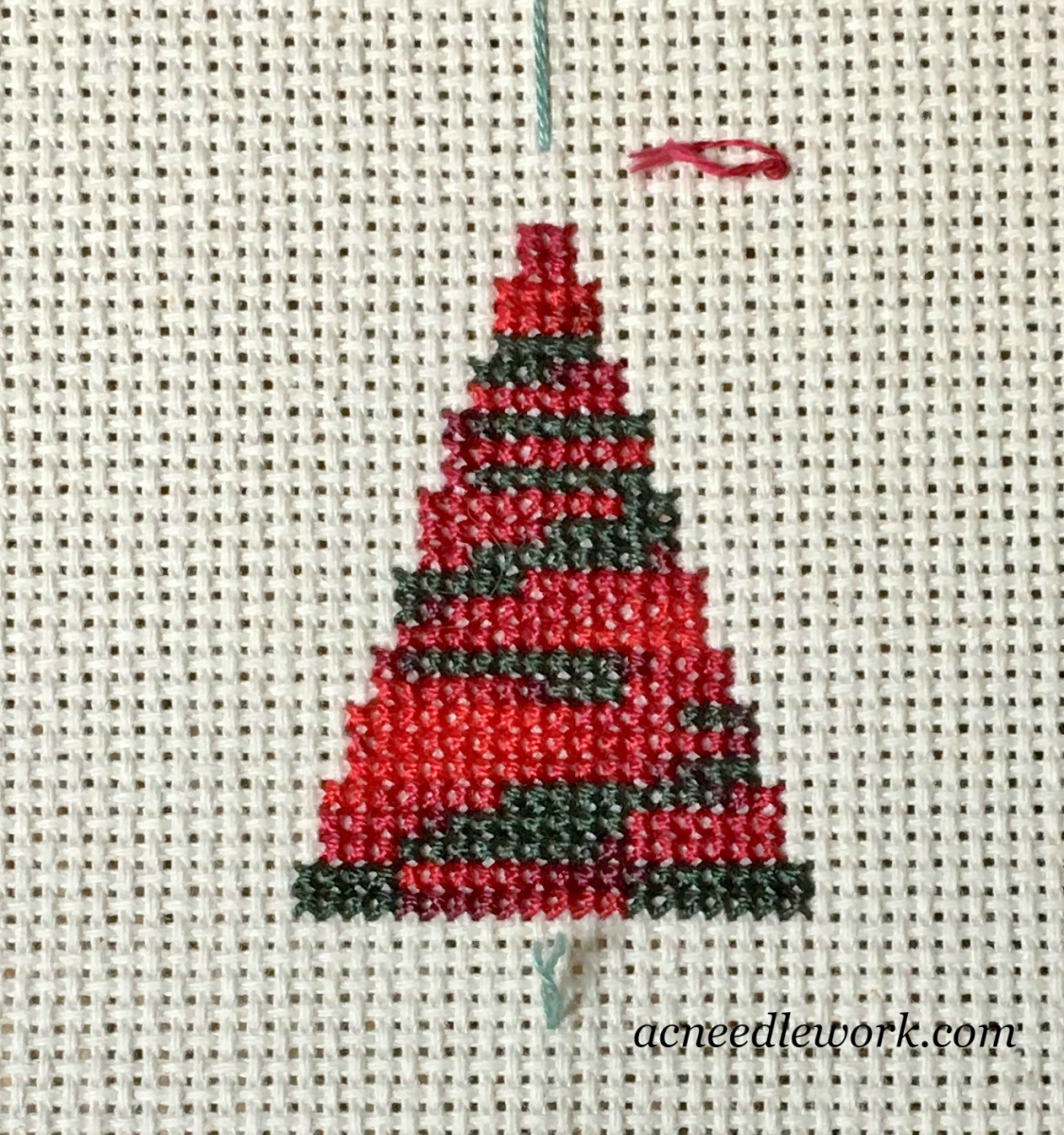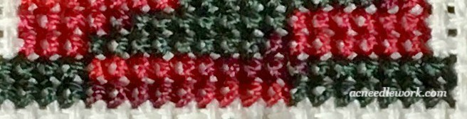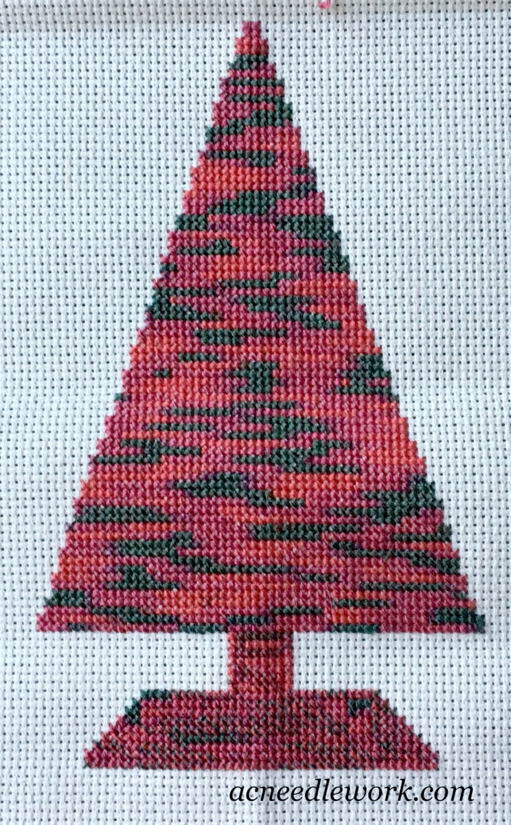 This is the result you get when you cross each half stitch as you go. Notice the blocks of color you get with this method. The tree in this project was stitched using this method.