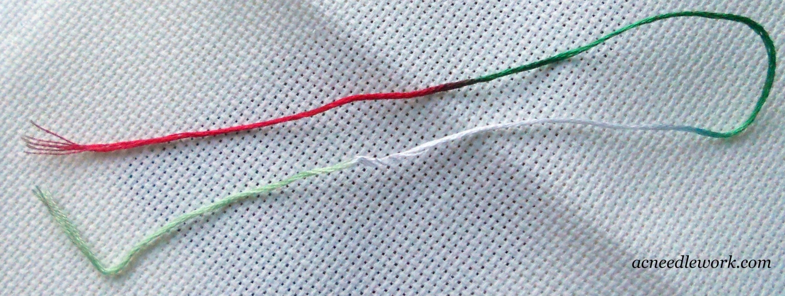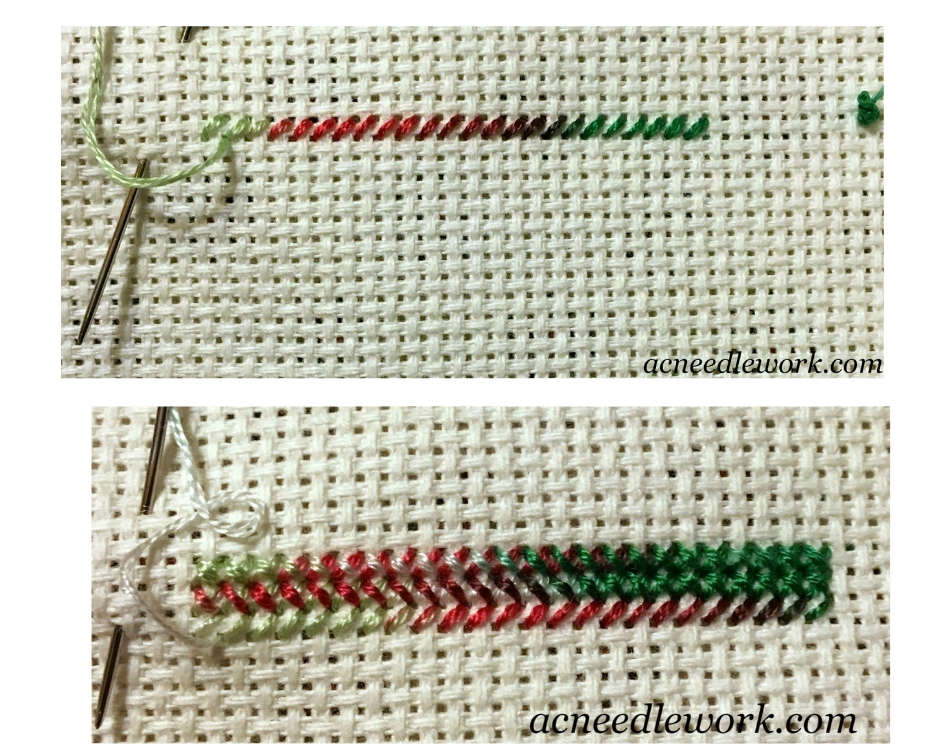 Cut the floss at the color you want to begin with. Stitch a row of half stitches. Then stitch back in the other direction with a single stitch.