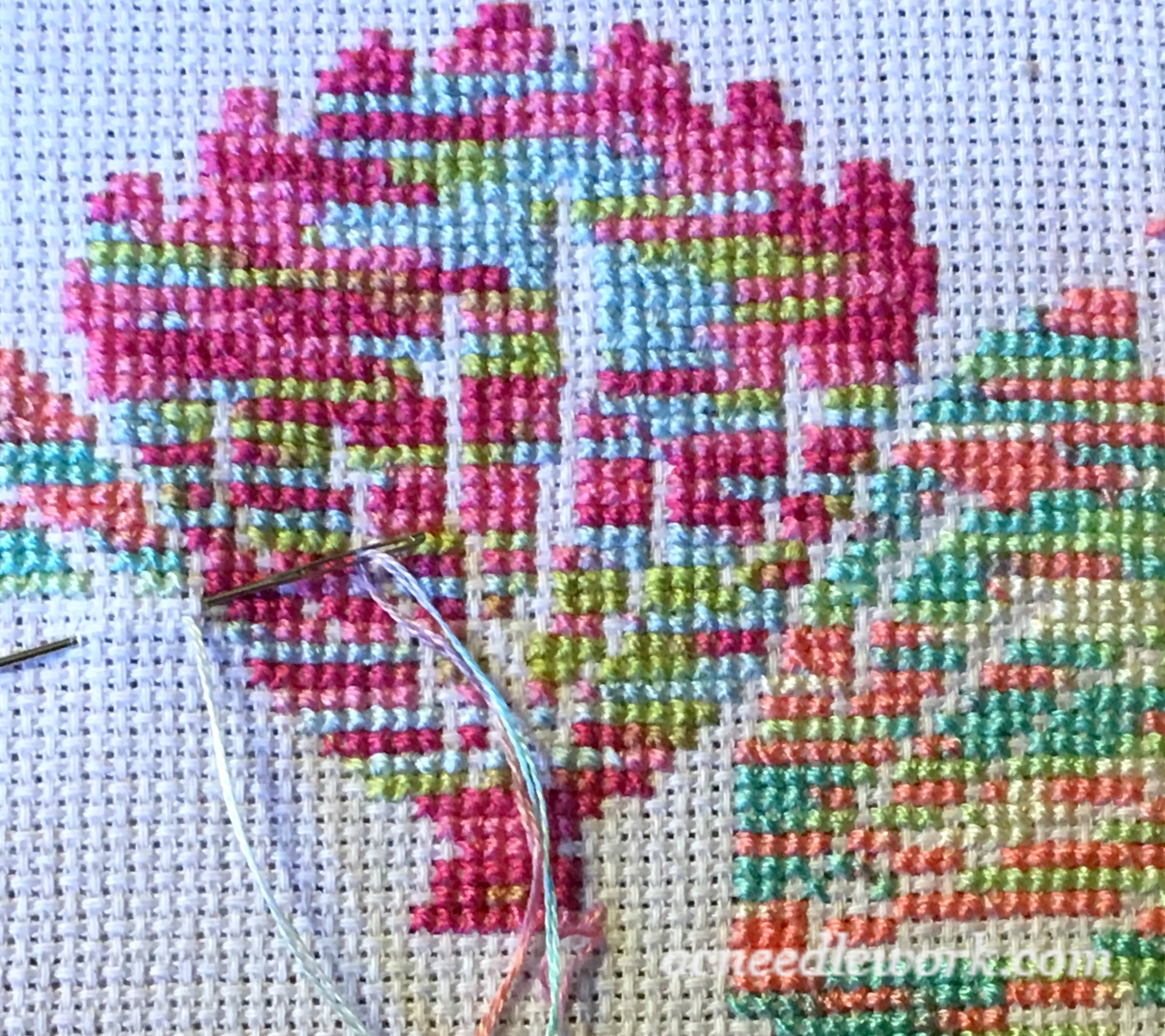Change the look of the piece by cutting your floss at different places in the skein. In the photo above, I started some rows with the pink portion of the thread, others with the blue or green. This is also an example of the look you get when you cross the stitches as you go. It is clear how the colors cluster together. It gives the look of stitching with four different skeins of six strand DMC floss.