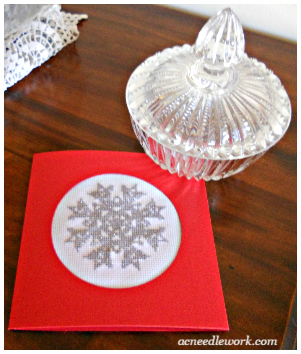 This snowflake is perfect for a greeting card. It doesn’t take long to stitch. I stitched the model in about eight hours, so it could be finished over a weekend or in several evenings. Since the project only uses 1 skein of floss and 1 spool of blending filament, pack the project in a zip lock bag and carry it around in a book bag or handbag. When you have wait time somewhere or even while you travel, stitch on the snowflake.